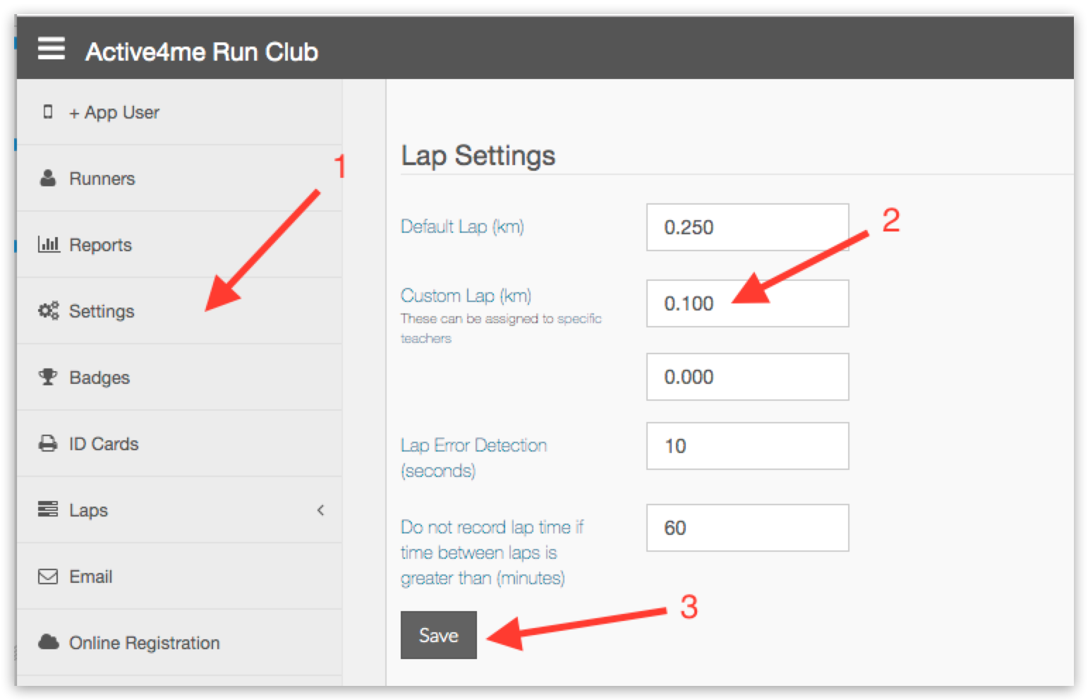 If your younger runners have a smaller track distance you can assign their teacher a custom lap distance.